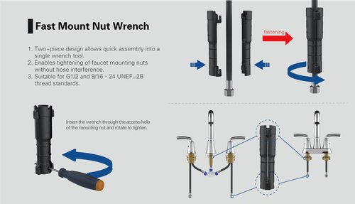 The faucet is equipped with a patented quick-installation tool system, consisting of a two-piece snap-fit structure that quickly assembles into a functional installation wrench. This design allows installers to bypass hoses and obstructions under the sink, making it significantly easier to position and tighten the mounting nut in confined spaces.