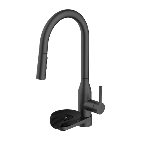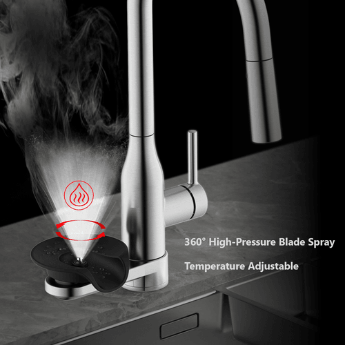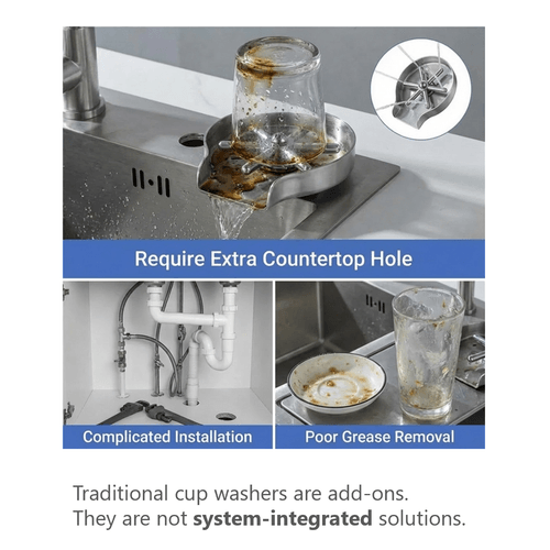 This innovative kitchen faucet integrates a glass rinser directly into the faucet body, creating a cleaner and more efficient sink setup without requiring an additional sink hole or extra plumbing connections. Unlike traditional glass rinsers that rely on a separate cold-water supply, the integrated design uses a dual-waterway cartridge to deliver mixed water, allowing the rinsing temperature to be adjusted for improved cleaning performance.