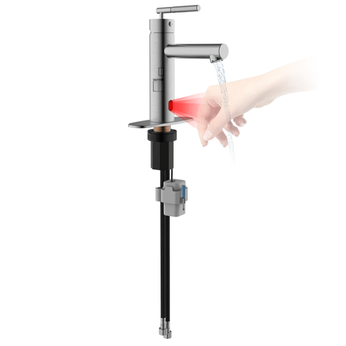 Equipped with an integrated infrared sensor, the faucet enables touchless operation for improved hygiene and user convenience. The all-in-one construction houses both the sensor and solenoid valve within the faucet body, eliminating external control boxes and ensuring a streamlined installation.